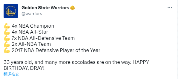 勇士官方还祝贺德拉蒙德-格林33岁生日快乐,晒出格林生涯至今的荣誉——4次总冠军、4次全明星、7次最佳防守阵容、2次最佳阵容和2017年年度最佳防守球员。