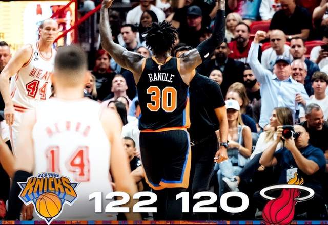 但不可思议的一幕发生了,兰德尔拿回皮球后,面对补防上来的热火球员,直接起身强行出手三分,结果直接落入篮筐!122-120,尼克斯极限绝杀。兰德尔非常兴奋,他高举双臂飞奔庆祝,而队友们也纷纷冲向兰德尔,向他表达祝贺。而另一边,热火球员们面面相觑,坐在板凳上的巴特勒和奥拉迪波一脸茫然,似乎没有回过神来。