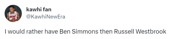 不少球迷都联想到了篮网的西蒙斯。西蒙斯也有不敢出手的问题,就算是对手放自己投,他也更愿意选择传球。在社媒上,多位球迷聊到威少时,都提到了本-西蒙斯,认为威少遭遇到了西蒙斯式的待遇。有球迷写道:“追梦对待威少,就好像他是本-西蒙斯一样,笑死我了。”还有一个署名是小卡球迷的写道:“我宁愿有本-西蒙斯,也不想要威少。”