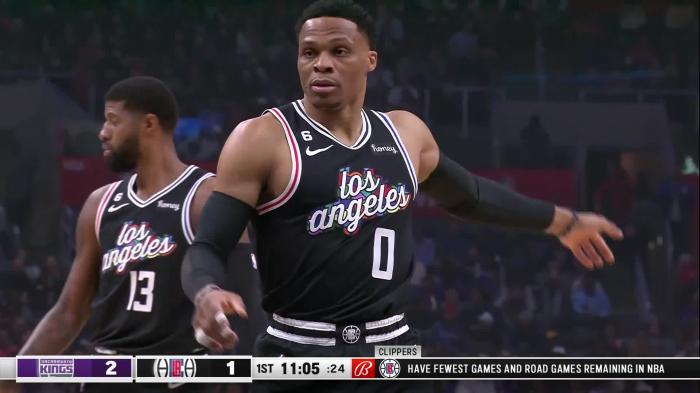 乔治外线连中三分,7分39秒,威少传球失误,和小莫配合出现失误,国王反击轻松得分;暂停回来,威少保护篮板,强起被小萨封盖;威少外线尝试三分打铁不中,6分01秒,乔治助攻威少上篮,威少打进快船生涯首个运动战进球,快船主场又沸腾起来了,老板激动手抖。