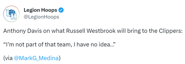 哈姆表示球队目标是冲进西部前六,避免附加赛。谈到本赛季剩余23场比赛,浓眉明确表示:“剩余每一场比赛对我们来说都是必须赢下的。”在被问及威少能够给快船带来什么帮助时,浓眉说道:“我不是那支球队的一员,我不知道。”此前,威少被爵士买断后,已经决定以底薪加盟快船。