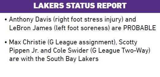 下一场对阵勇士,湖人官方宣布詹姆斯(左脚酸痛)和浓眉(右脚应力伤病)大概率出战,75%可能性出战;克里斯蒂和斯威德仍在发展联盟。