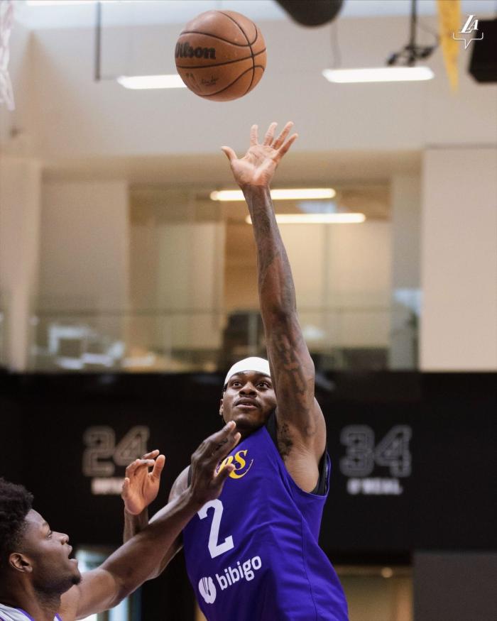 经过一段时间的休息,湖人众将回归球馆,队内训练,班巴和加布里埃尔跳球,期间班巴上演双手暴扣;拉塞尔赤膊训练,训练中秀中投;施罗德突破包夹强硬上篮;训练之余,哈姆紧紧抱着浓眉,哈帅满脸笑容太开心。