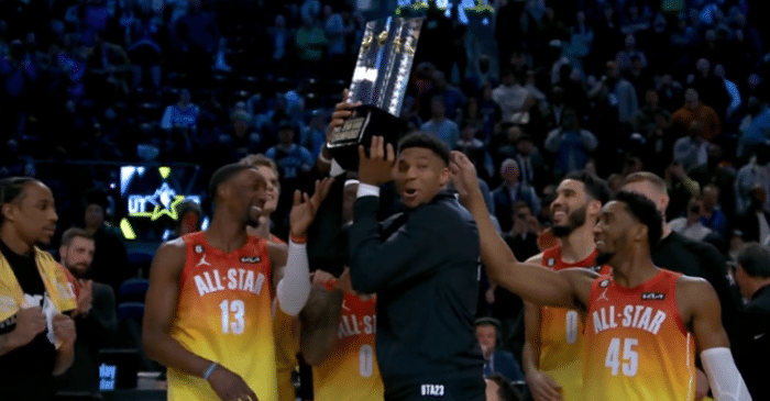 末节塔图姆继续得分,扣篮不成造恩比德犯规,两罚一中破纪录,之后突破上篮又得分,利拉德三分终结比赛,最终字母哥队184-175击败詹姆斯队,塔图姆夺得全明星赛MVP,生涯首次当选,字母哥抱着全明星赛冠军奖杯不撒手。