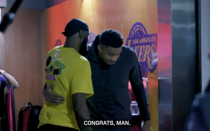 当时阿德托昆博拥抱老詹,并说:这都20年了,你表现如此出色的时间太久了。我一直是你最大的粉丝。祝贺你!你为所有人设立了蓝图,无论谁愿意遵循它,结果都会是很好的。