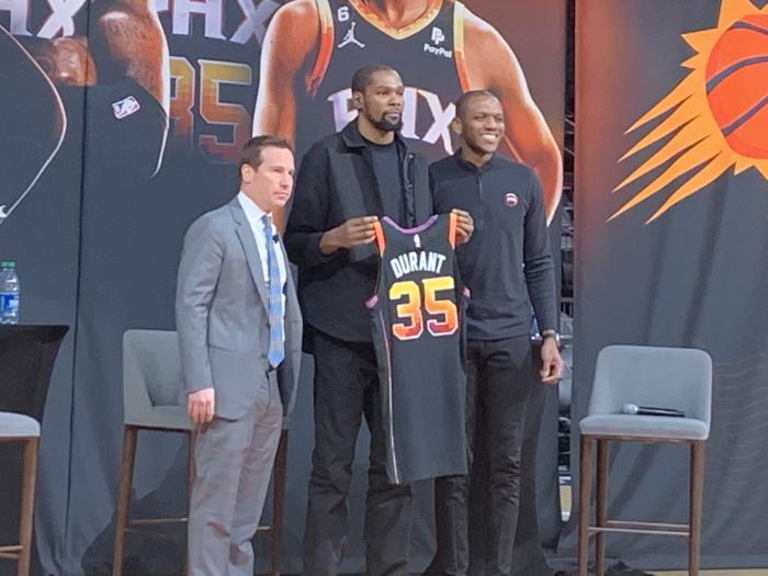 今日杜兰特正式亮相,身穿太阳队35号球衣拍摄定妆照,在新闻发布会现场,杜兰特感激篮网,直言这是非常特别的四年,祝篮网未来一切顺利。