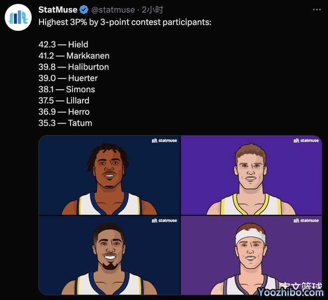 值得一提的是,本届全明星三分赛的参赛选手中没有任何一名球员三分命中率位居榜单前十,命中率最高的希尔德排名第11名,而最低的塔图姆则是排名第100。