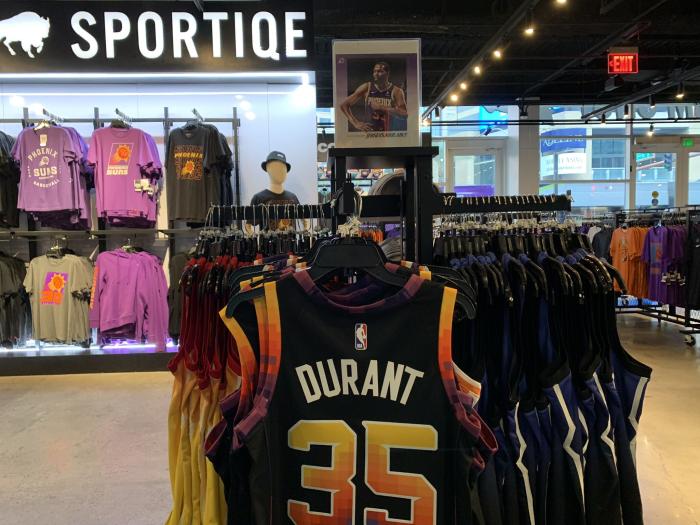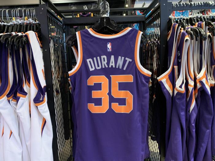 “欢迎杜兰特来到菲尼克斯”,太阳当地已经出现多处欢迎KD的广告牌,杜兰特的太阳队35号球衣已经在商店中全面上架,商店中挂满了杜兰特的球衣,还贴着杜兰特身穿太阳球衣的海报。