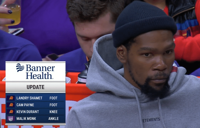 太阳宣布杜兰特因伤缺席今天与国王的比赛,不过杜兰特来到现场观战,参观太阳更衣室并且赛前向新队友们问好,这是杜兰特加盟太阳后首次在新东家主场足迹中心球馆亮相,全场球迷为他欢呼,KD满脸笑容。