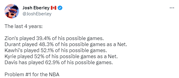 过去4年,锡安的上场率仅仅只有39.4%,生涯4年仅仅只打了114场比赛,伤病严重影响了他的生涯,天才状元确实不配成为詹姆斯的接班人;除了锡安之外,杜兰特、小卡、欧文和浓眉在过去4年也受到伤病的困扰,不过他们都没有锡安缺席的场次多。