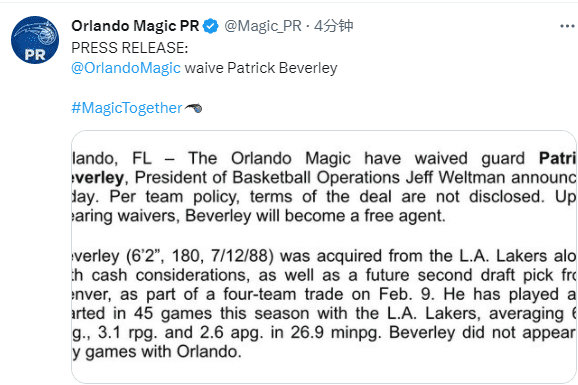 在今年交易截止日,湖人把贝弗利交易到魔术,换来中锋班巴;贝弗利被送走后和魔术商讨买断,最终双方达成协议,魔术官宣裁掉贝弗利,48小时澄清期后,贝弗利将成为自由球员,热火和公牛是贝弗利的潜在下家。