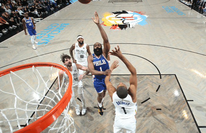 比赛正式开打,76人开场被篮网打出16-6攻势,之后哈登命中三分,恩比德更是发力不断砍分,里突外投以及多次造犯规罚球得分额,单节5投4中独砍14分6篮板;哈登单节贡献7分,两人包揽76人第一节首发全部得分;值得一提的是,哈登一拿球就被嘘,罚球时更被篮网球迷称为“叛徒”。