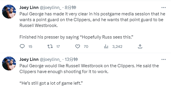 乔治公开招募威少加盟快船,值得一提的是,当年乔治加盟雷霆的一大原因就是威少出面招募,如今威少来到了生涯的关键时刻,若他决定与爵士达成买断,威少可能加盟快船重返洛杉矶,从而联手小卡和乔治冲击总冠军。