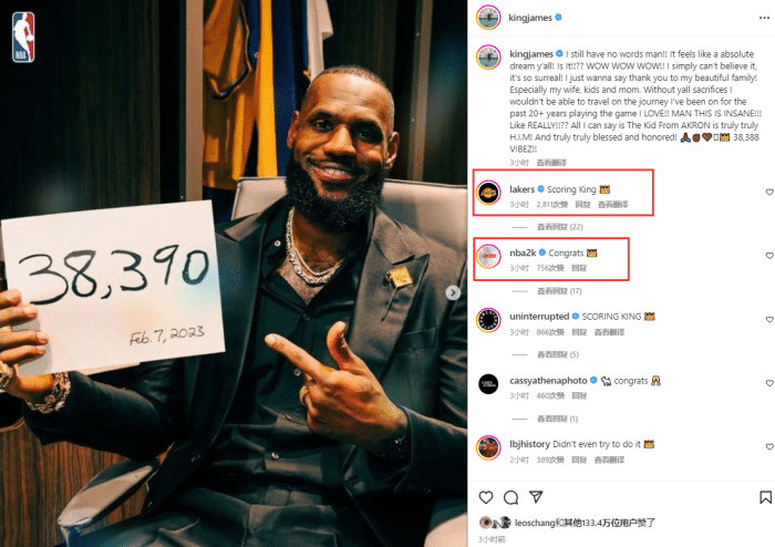 詹姆斯庆祝动态引热议,湖人官方在评论区留言:国王,历史得分王。