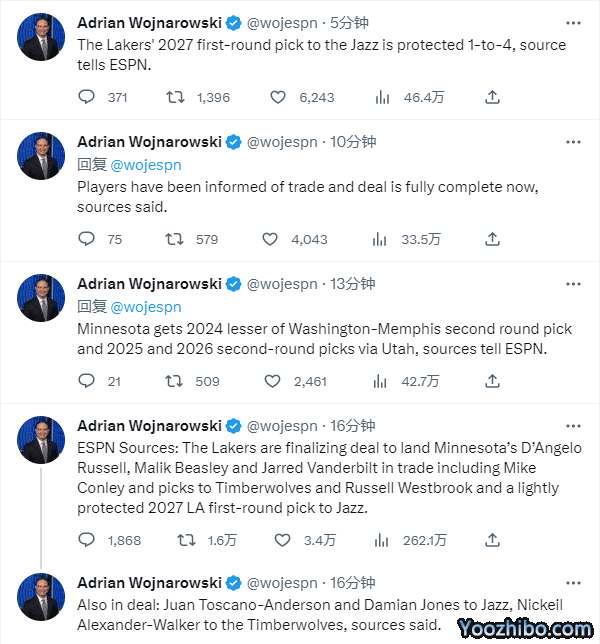 爵士得到威少、托斯卡诺-安德森、达米安-琼斯和一个来自湖人2027年受保护(1-4顺位)的首轮签;