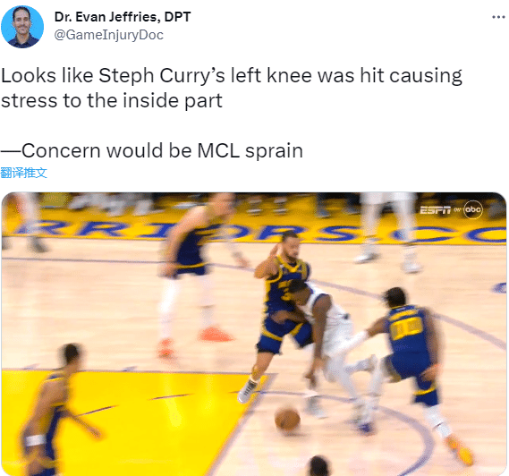 对于库里受伤一幕,医学专家Evan Jeffries表示,库里的膝盖被撞,担忧遭遇膝盖副韧带扭伤,如此伤病类似于杜兰特的膝伤,若库里遭遇如此伤病,恐至少伤停一个月。