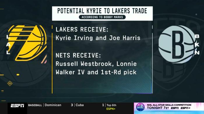 NBA薪资专家Bobby Marks列出湖人和篮网3换2交易方案,湖人送走威少、朗尼-沃克和一个首轮签,从篮网得到欧文和乔-哈里斯。