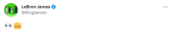 24直播网02月04日讯 ,距离交易截止日还剩6天,湖人酝酿大交易,与爵士谈判关于威少的交易;还将与篮网谈判关于欧文的交易;欧文申请离队后,詹姆斯疑似发声回应,晒王冠+眼睛表情,言外之意就是国王看到了。