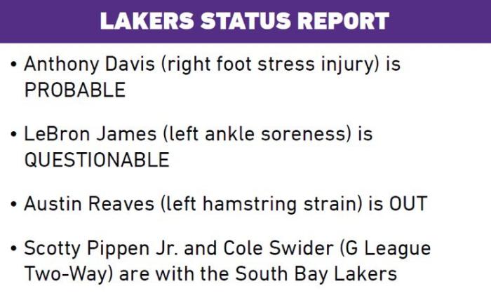 24直播网02月04日讯 湖人官方公布下一场对阵鹈鹕的伤病报告,浓眉(右脚应激反应)大概率出战,詹姆斯(左脚踝酸痛)出战成疑;里夫斯(左腿筋拉伤)、小皮蓬(发展联盟)和斯威德(发展联盟)继续缺席比赛。