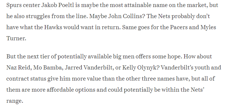 Kevin O'Connor还表示,相比于珀尔特尔与科林斯,纳兹-里德、班巴、范德比尔特与奥利尼克对于篮网说是更加实惠的选择,他们都在篮网补强的名单之内,其中范德比尔特的年纪(23岁)和合同状态让他比其他三个人更有价值。