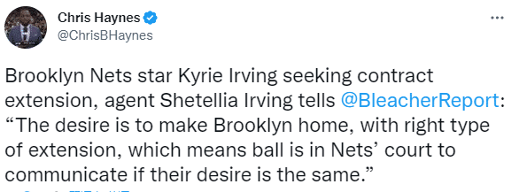 据报道,欧文经纪人Shetellia Irving接受采访时表示:欧文会留守篮网吗?我们已经就此事联系了篮网,但目前还没有进行过有意义的对话,我们的愿望是把布鲁克林作为自己的家,并以正确的方式续约。