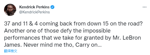 对于詹姆斯的表现,名嘴帕金斯发推写道:砍下37+11+4,并在客场落后25分的情况下逆转?勒布朗-詹姆斯先生再次上演了‘挑战不可能’表演。