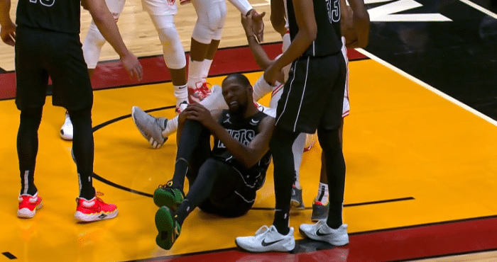 第三节,巴特勒持球突破赛斯-库里,跳步杀到禁区,上篮时被西蒙斯大帽,巴特勒身体失去平衡并且摔倒,杜兰特不幸遭殃,被巴特勒压伤膝盖;杜兰特穿上鞋子坚持一会后主动要求下场,并且返回更衣室接受检查,最终篮网官方宣布杜兰特因右膝受伤,本场比赛不会回归。