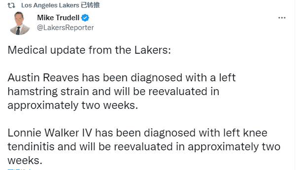 湖人官方更新球队伤情,里夫斯遭遇左腿筋拉伤,将在2周后复查;朗尼-沃克因左膝肌腱炎,也将至少再休战2周。