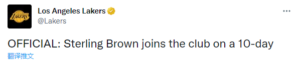 湖人官方正式宣布,球队已经和锋卫摇摆人斯特林-布朗签下一份10天短合同,他将身披湖人9号球衣,并且可以出战今天湖人与老鹰的比赛;未来10天,他可以为湖人打5场比赛,由于湖人伤员太多,只能应急签下斯特林-布朗。