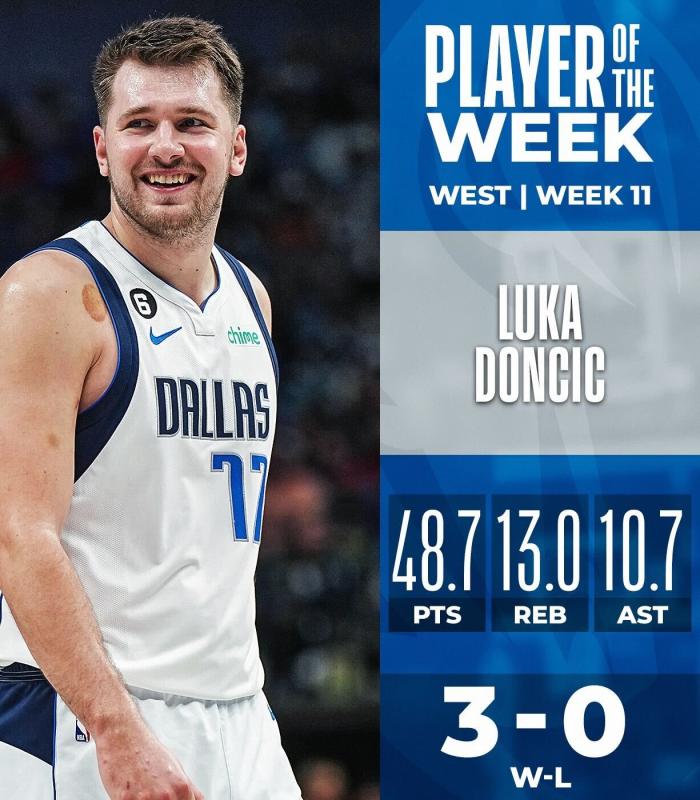 NBA官宣!东契奇场均48+三双再获周最佳 波神上榜詹皇杜兰特获提名