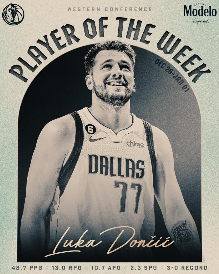 东契奇连续2周夺得周最佳,生涯第9次当选,独行侠官方第一时间祝贺卢卡。