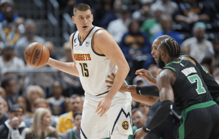 第四节,掘金接连命中4记三分,其中海兰德打疯了,连中3记三分助掘金保持领先,期间海兰德和杰伦-布朗发生口角险引冲突;6分43秒工作人员校正篮筐,好像是被罗威扣篮时拽歪了,篮筐歪了导致比赛中断超过30分钟,没修好最终更换新的篮筐,期间约基奇折返跑保持状态;比赛继续,约基奇继续得分以及保护篮板,拿到30+三双,最终带队稳稳拿下比赛。