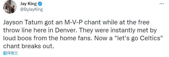 值得一提的是,第二节塔图姆罚球时现场的绿军球迷为他高呼MVP并且呐喊“凯尔特人加油”,掘金球迷立即狂嘘,用嘘声盖住绿军球迷的呼声。