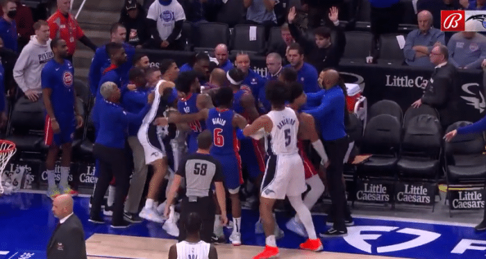 第二节还剩30多秒,海耶斯救球时被大莫瓦格纳阴招推倒,迪亚洛冲过来从背后推搡大瓦格纳,海耶斯站起来后,一记重拳打到瓦格纳的后脑勺,冲突发生在活塞替补席,活塞球员蜂拥而至险些引发围殴,现场十分混乱,班凯罗等魔术球员也冲过来拉架,之后他们被拉开,瓦格纳捂着后脑勺十分痛苦。