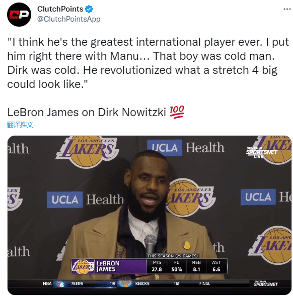 谈到诺维斯基的雕像正式揭幕,詹姆斯表示:我认为德克是史上最伟大的国际球员,我认为他跟吉诺比利是一个档次的,他是个冷血杀手,他彻底改变了4号位的打法,德克非常棒,这毋庸置疑。