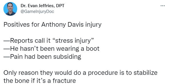5、医学专家Jeff Stotts表示这种伤病在NBA比较常见,浓眉可能是跖骨或者中足骨骼损伤