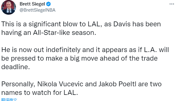 浓眉无限期休战是对湖人的一大重创,他的伤情将会影响湖人的交易计划,NBA记者Brett Siegel浓眉无限期缺战,看起来湖人将会在交易截止日前采取重大举措,武切维奇和铂尔特尔是湖人值得关注的引援对象。