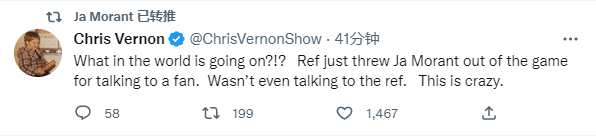 莫兰特被驱逐后,他在推特上转发动态表达不满,推文内容分别是:这到底是怎么回事?裁判刚刚因为莫兰特与球迷交谈被驱逐,甚至没有和裁判说话。这太疯狂了。