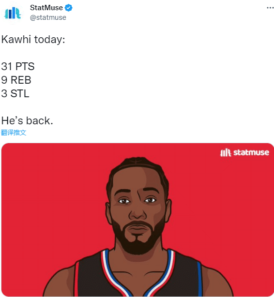 小卡31分和3次抢断创赛季新高,本赛季第一次拿到30+,也是2021年4月后首次单场轰下30+;美媒直呼他回来了;小卡正式宣布王者回归,赛后泰伦-卢表示小卡在第二节、第三节和第四节加快了速度,他的进攻对我们很重要。