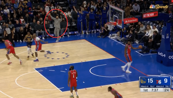 库里因伤缺席比赛,勇士残阵开场23-13打停76人,悍将迪温琴佐手感滚烫,接连轰进4记三分疯狂砍分,45度角和底角三分都一击即中,看到队友的状态这么好,库里激动地坐不住,站在场边高举双手为队友庆祝,还坐在替补席挥手蹬腿以及站起来怒吼庆祝。