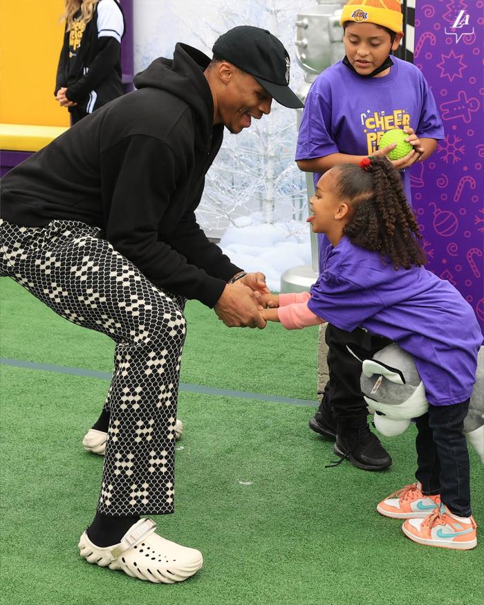 湖人官方晒出众将参加圣诞活动的画面,詹姆斯身穿湖人黑色连帽卫衣,开心地和小球迷击掌;在活动现场,詹姆斯从背后抱着浓眉,两人都咧嘴大笑十分开心;威少身穿潮流长裤、戴着棒球帽和小球迷互动,开心之情溢于言表。