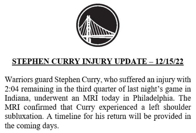 在勇士和步行者比赛中,库里伸手切球时不幸遭遇左肩伤病,库里捂着左肩十分痛苦,先是坐回替补席,之后在队医的陪同下返回更衣室接受检查,最终勇士宣布库里因左肩受伤而提前退出比赛;伤退前,库里轰下38分7篮板7助攻。