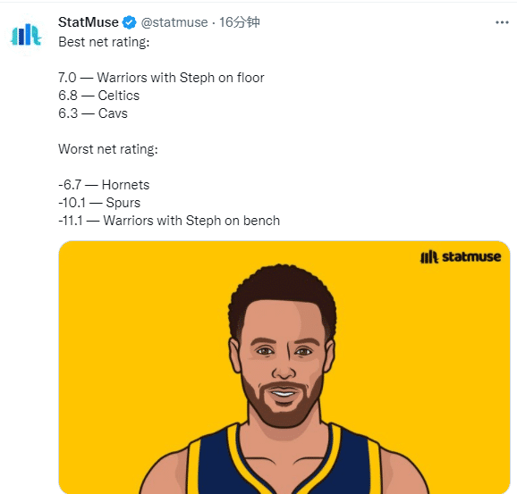库里伤停将对勇士战绩有很大的影响,本赛季库里缺席比赛时,勇士0胜3负,3场比赛狂输55分;美媒StatMuse晒出了一组库里在场与库里不在场时,勇士的净效率值与联盟前列或垫底球队的对比:库里在场时 勇士净效率值+7.0(联盟第一绿军+6.8,联盟第二骑士+6.3);库里不在场时 勇士净效率值-11.1(联盟倒一马刺-10.1,联盟倒二黄蜂-6.7)