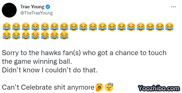 特雷-杨在主场扔球庆祝被罚款,之后吹杨发推道歉,写道:对不起,老鹰队的球迷们,他们有机会触碰到赢得比赛的比赛用球,以后再也不能这样庆祝了。(27个笑哭表情)