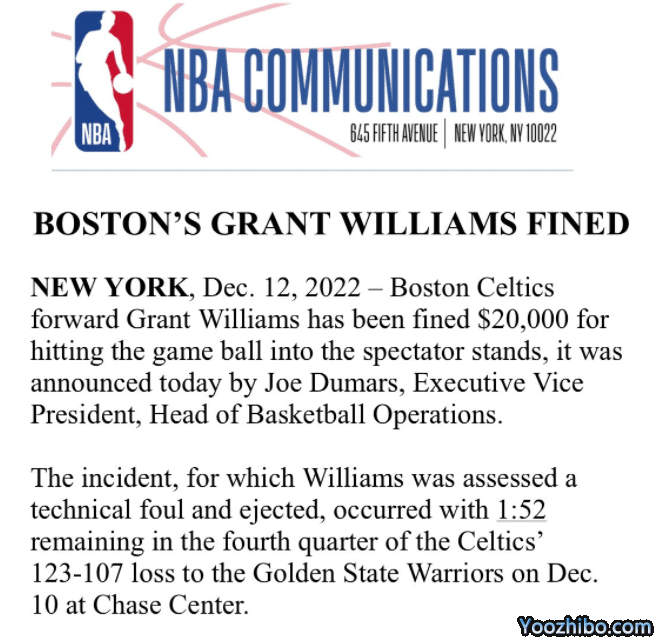 来源:24直播网12-13 11:5324直播网12月13日,NBA官方公布两笔罚单,凯尔特人悍将格兰特-威廉姆斯因把球击飞到观众席被追加罚款2万美元,老鹰球星特雷-杨因扔球庆祝被罚款2.5万美元。