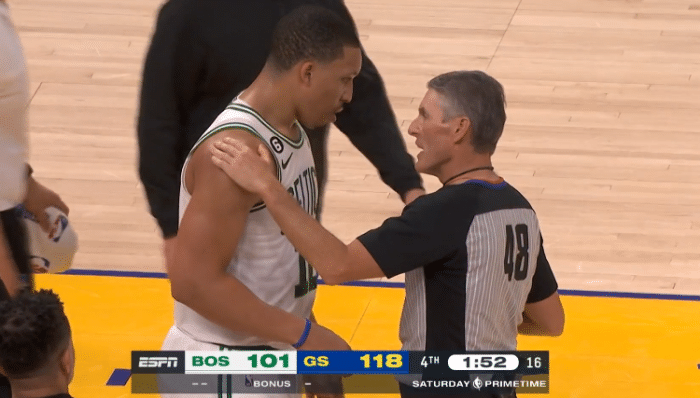 终场前1分52秒,凯尔特人101-118落后勇士17分,此时比赛已经失去悬念,绿军悍将格威十分沮丧,在皮球弹向他的时候,他一拳将其击到观众席,裁判立刻给了他一个技术犯规,并且把他驱逐离场;之后格威和裁判理论,然后他提前离场返回更衣室。