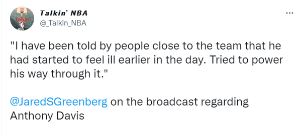 现场TNT记者Jared Greenberg报道,与球队关系密切的人士透露,浓眉在今天早些时候就感觉不舒服,他本想坚持打完比赛;最终浓眉带病坚持打了8分钟就无奈地退出比赛。