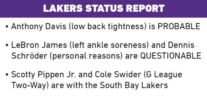来源:24直播网12-04 11:2824直播网12月04日,湖人官方公布下一场对阵奇才的伤情,浓眉(背部紧张)大概率出战(75%可能性出战)、詹姆斯(左脚踝酸痛)和施罗德(个人原因)出战成疑(50%可能性出战),小皮蓬和斯威德仍旧跟随南湾湖人打比赛。