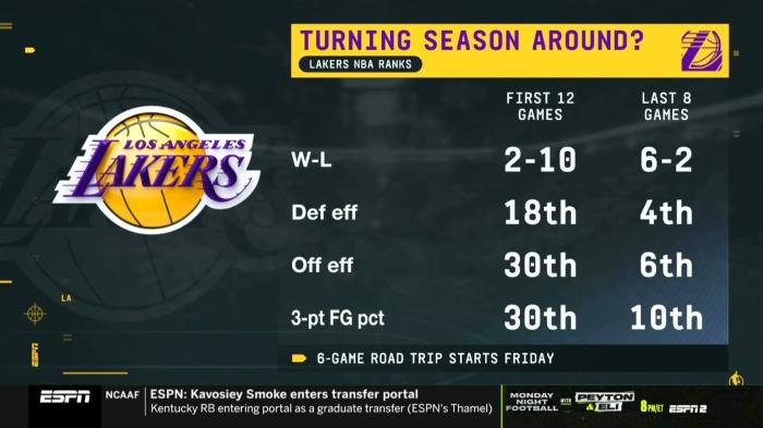 湖人开赛2胜10负的战绩十分糟糕,防守效率联盟第18,进攻效率联盟倒数第一,三分命中率联盟倒数第一;不过最近8场比赛,湖人湖人6胜2负,防守效率联盟第4,进攻效率联盟第6,三分命中率联盟第10。