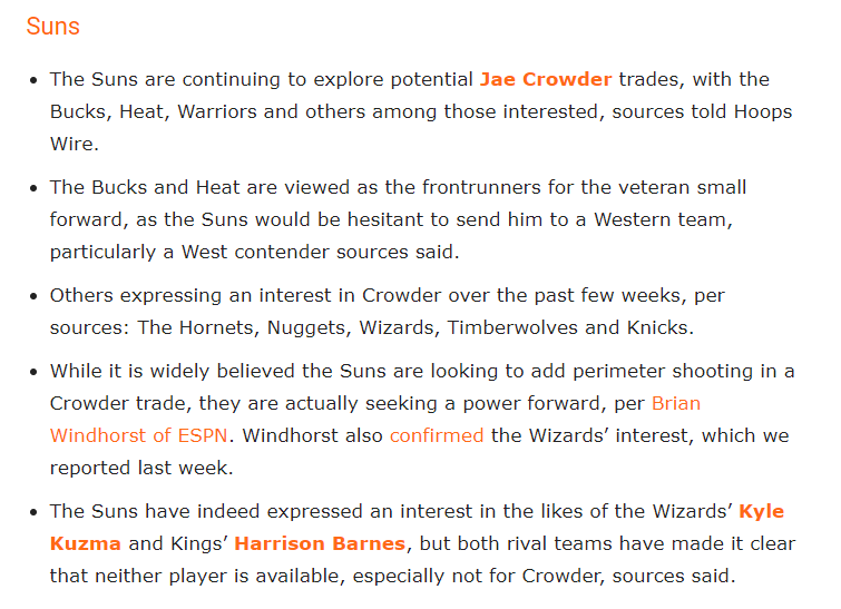 此外,太阳确实表达了对奇才前锋库兹马和国王前锋哈里森-巴恩斯的兴趣,但两支球队都表明,这两名球员都是他们的非卖品,尤其是以克劳德为筹码的交易。
